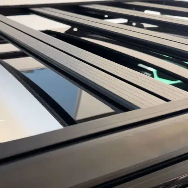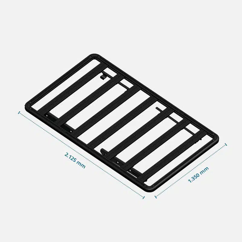 Die umlaufende T-Schiene ermöglicht die sichere und flexible Befestigung von Zubehör wie Dachzelten, Transportboxen, Werkzeugen oder weiterem Offroad-Equipment. Mit den Maßen 2125 x 1350 mm bietet die Plattform großzügigen Stauraum auf dem Fahrzeugdach. Ein aerodynamischer Windabweiser reduziert zudem Fahrtgeräusche.