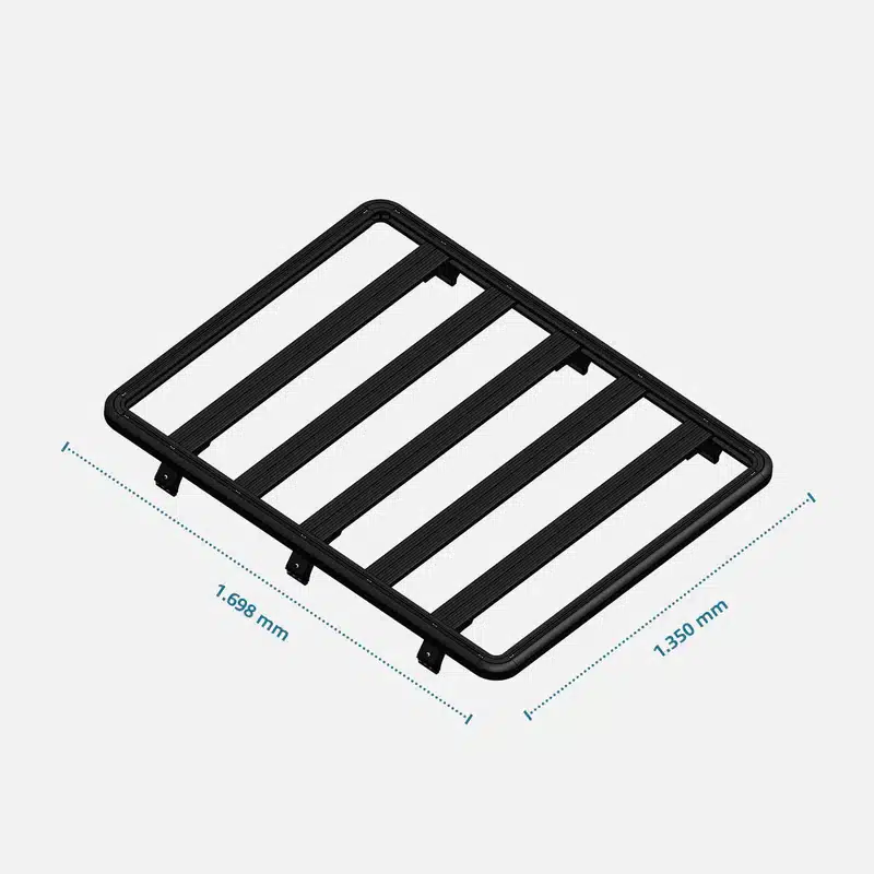 Der Dachträger besteht aus pulverbeschichtetem Aluminium 6063, wiegt nur 21,5 kg und bietet dennoch eine dynamische Tragfähigkeit von bis zu 100 kg sowie eine statische Tragfähigkeit von bis zu 300 kg. Die umlaufende T-Schiene ermöglicht die flexible Befestigung zahlreicher Zubehörteile mit Nutensteinen, sodass der Dachträger individuell angepasst werden kann.