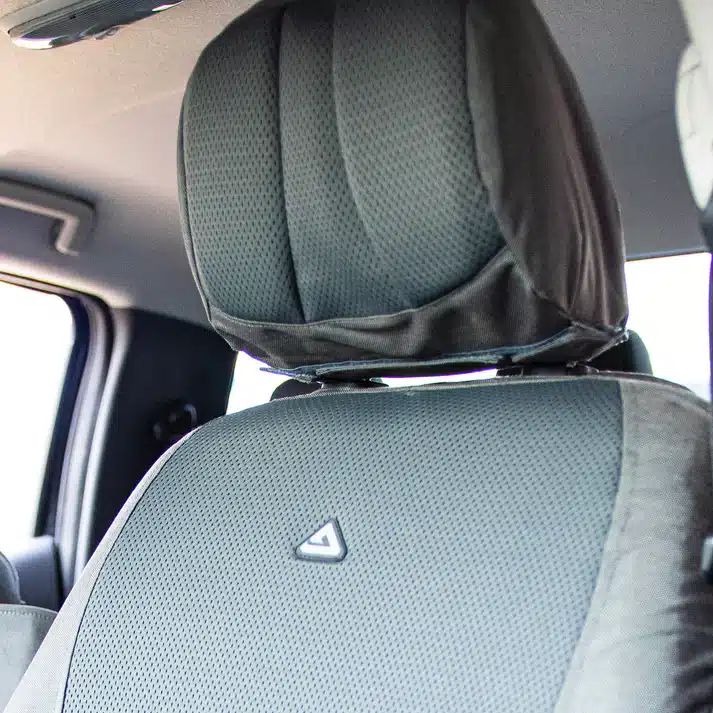 The headrest covers are also equipped with Velcro areas for attaching small pouches or accessories. Both seat covers come with a bottle holder, which attaches easily to the side of the backrest via Velcro – keeping drinks always within reach.