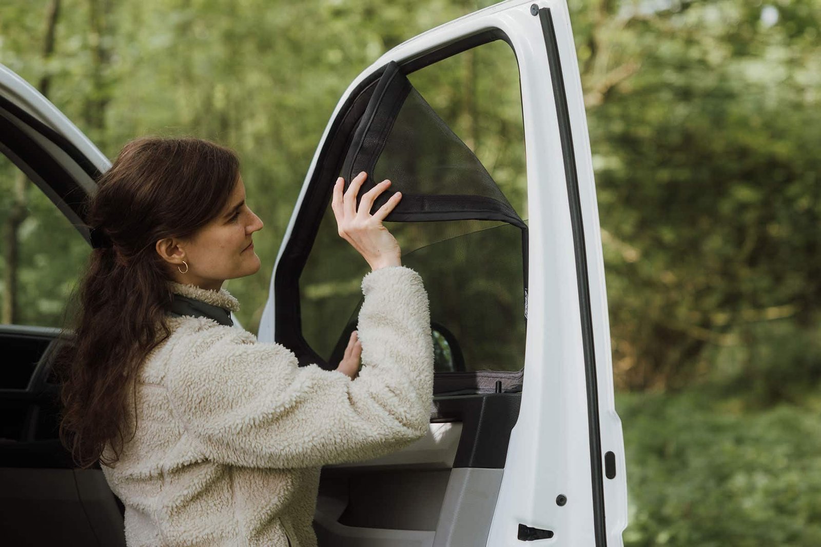 Thanks to sewn-in magnets, the mosquito net is easily attached to the door windows. It is custom-made for VW Caddy 5 and Ford Tourneo Connect, ensuring a perfect fit without gaps for insects.