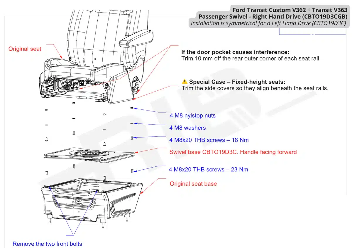 The swivel base for the passenger seat is specifically designed for the Ford Transit Custom V710 (from 10/2023) and allows the seat to rotate 180°, quickly transforming the driver’s cabin into a comfortable living area. It is an ideal solution for camper vans, van conversions, and travel vehicles that want to make the most of the available interior space.