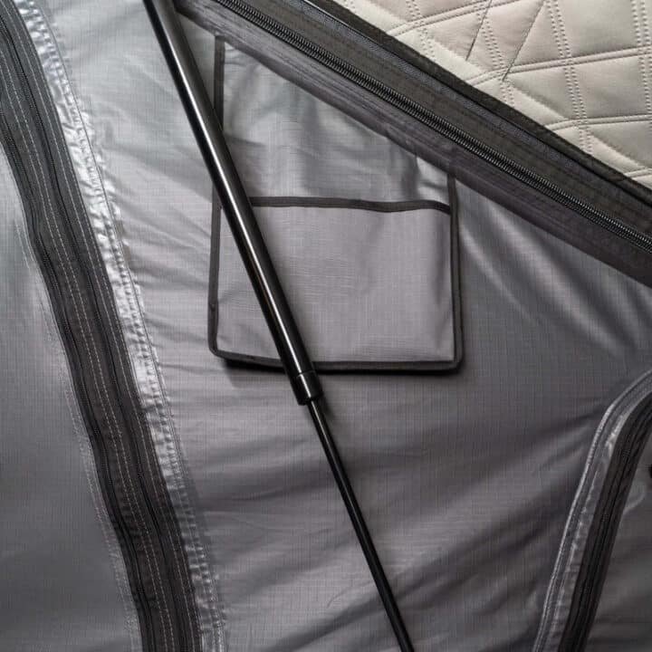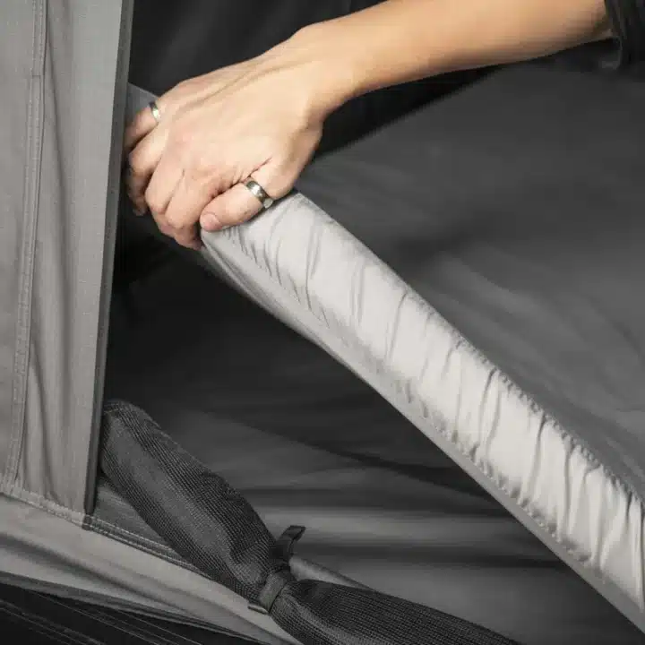 La tenda Cloud si apre facilmente anche da soli in meno di 3 minuti grazie alle molle a gas integrate. Basta aprire le quattro chiusure, sollevare la tenda e inserire le aste di supporto del frontale per essere pronti a partire.