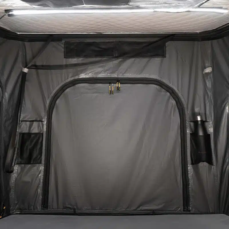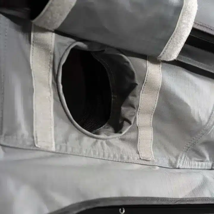 La tenda dispone di aperture per ventilazione e di un ingresso dedicato per un riscaldamento opzionale, per mantenere il clima interno ideale anche nelle notti più fredde.