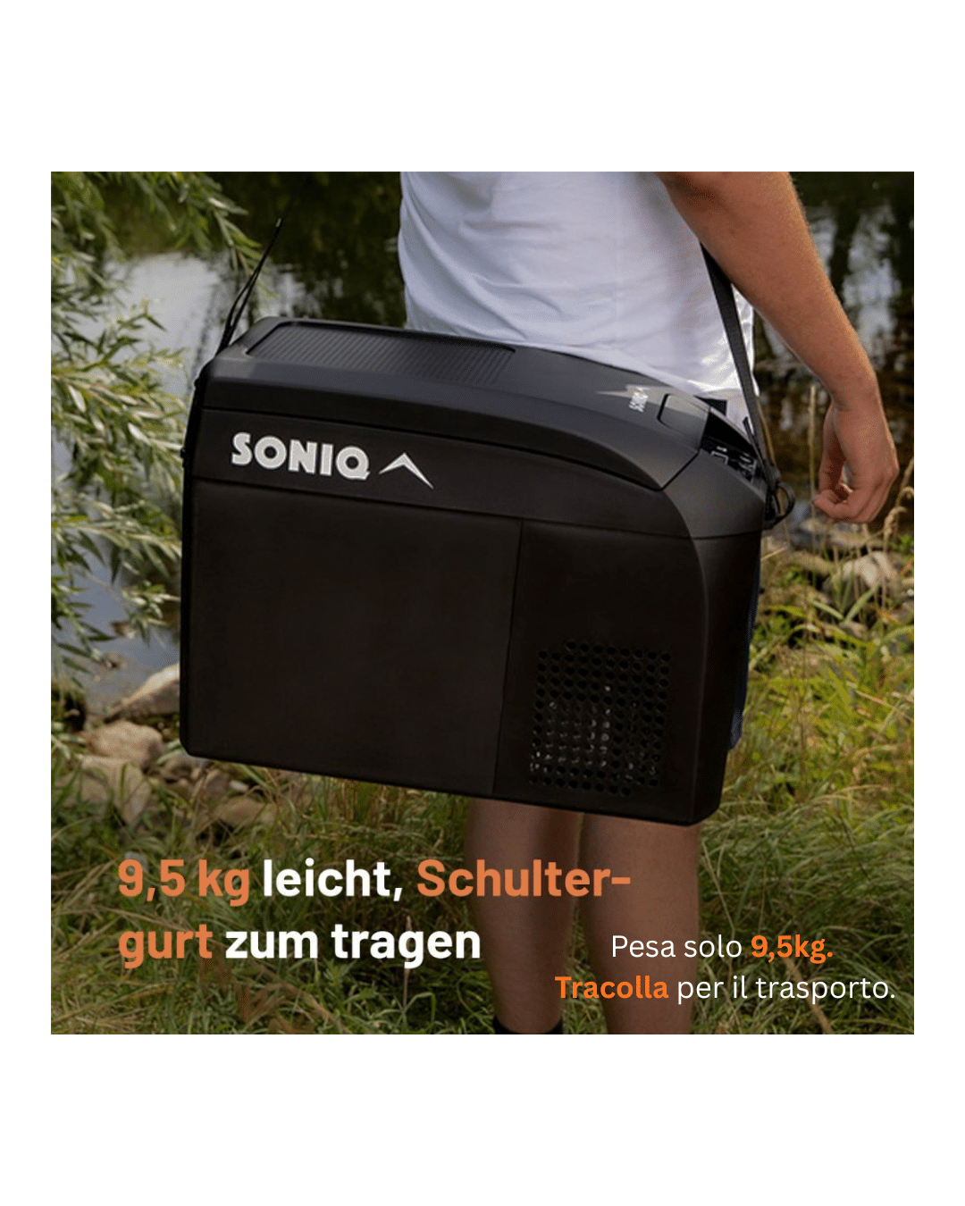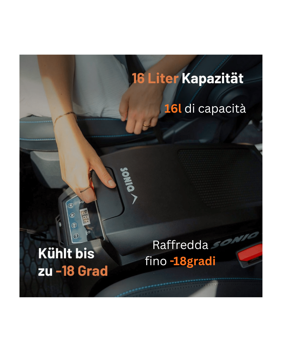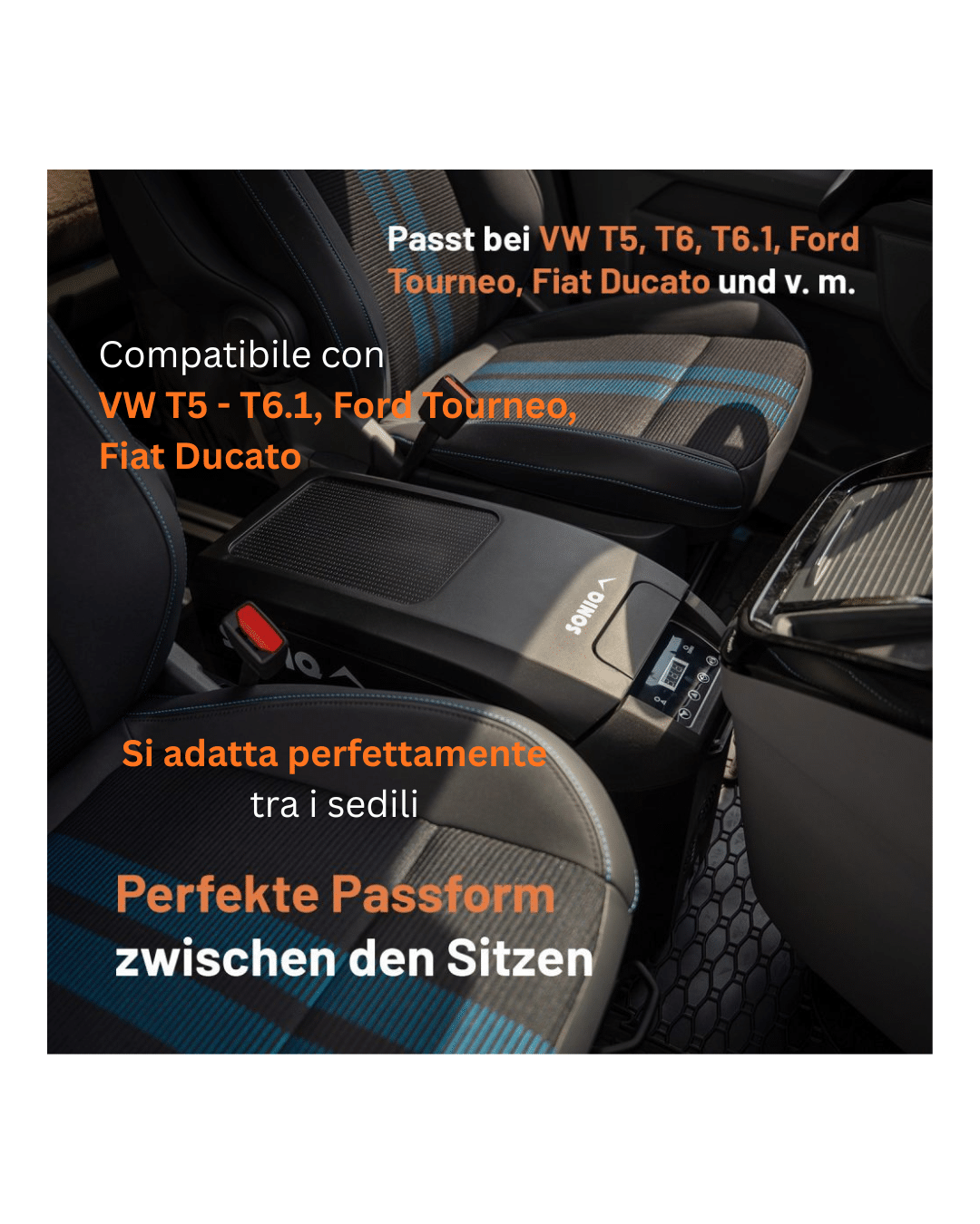 Soniq – il frigo a compressore da 16 litri è la soluzione ideale per chi non vuole rinunciare a cibi e bevande fresche anche in viaggio. Progettato appositamente per veicoli come VW T5, VW T6, Ford Tourneo e Fiat Ducato, si inserisce perfettamente tra il sedile del conducente e quello del passeggero, sfruttando al massimo lo spazio disponibile.
