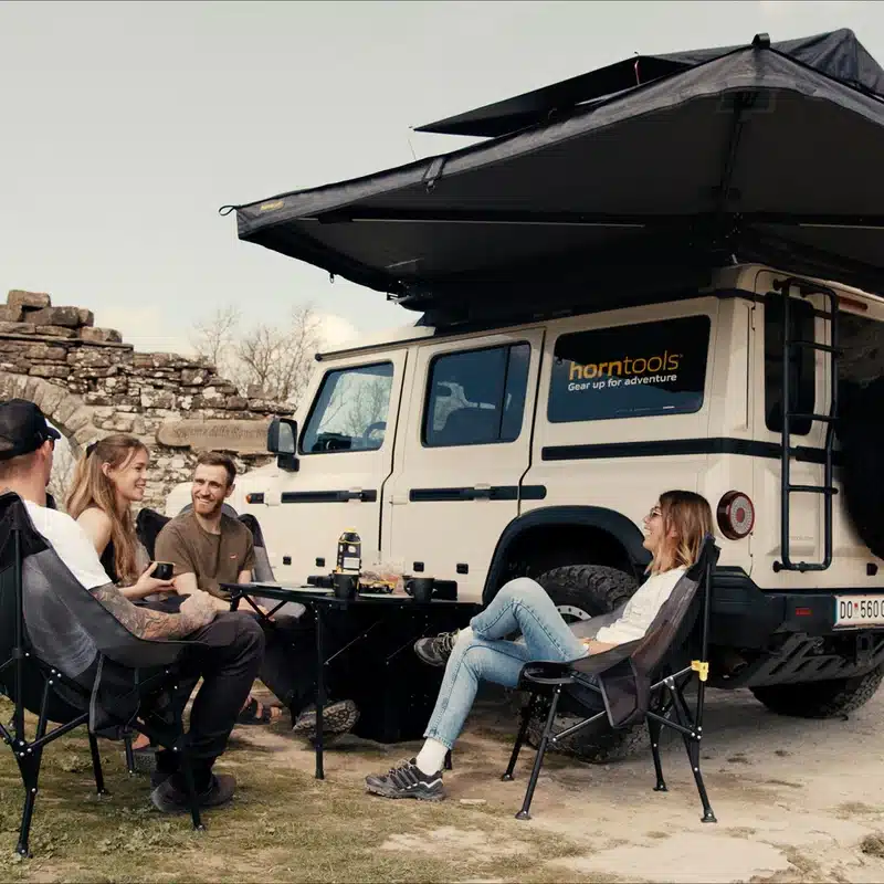 Il tendalino horntools Horizon 270° è uno dei tendalini autoportanti più leggeri della sua categoria. Progettato per affrontare condizioni impegnative, offre un’ampia superficie di protezione contro sole e pioggia durante le avventure overland, off-road e outdoor.